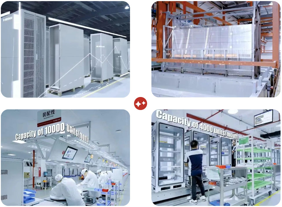 集成车间引进了户外柜生产线,产能平均高达4000台/月)。采用电子看板,可实时显示工序SOP,设有淋水防护测试、性能测试,扫码系统,并单独设立了嵌入式电源ATE测试工位,可实现电源的自动检测和数据记录。同时引进了微站电池生产线,产能高达10000台/月),采用电子看板,设有耐压测试、气密测试,并单独设立了ATE测试、充放电老化测试工位,进行严格、专业的安全、性能及可靠性测试。